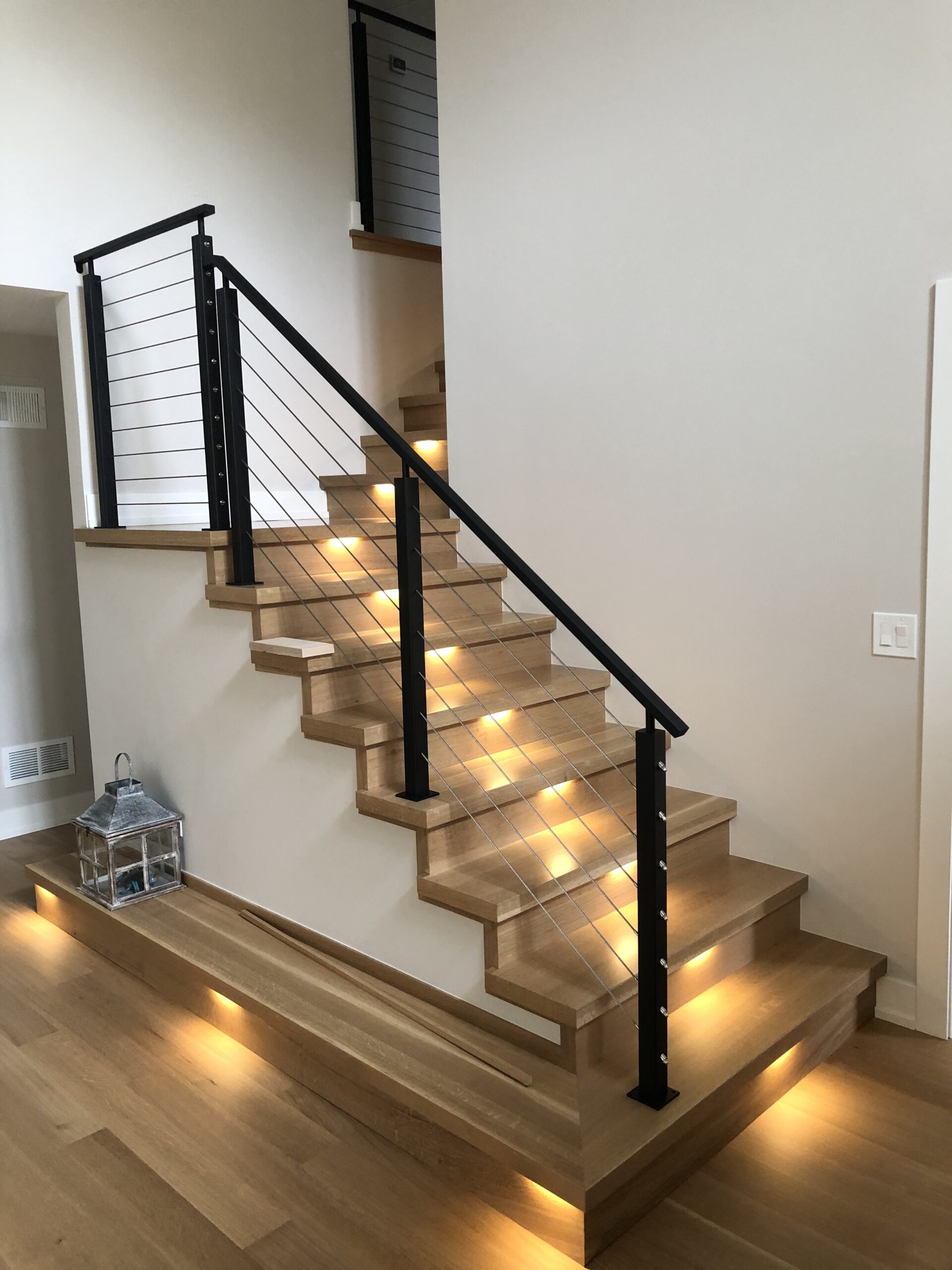 Modern Stairs 04 By April 23, 2023April 23, 202304 - Modern Stairs Materials:White Oak Thick TreadsPoplar StringersWhite Oak RisersWhite Oak Oak Nosings with Thick FrontsBlack Steel Tubing HandrailsStainless Steel Wire Cable Railing SystemBlack Iron Newel Posts with Handrail Brackets